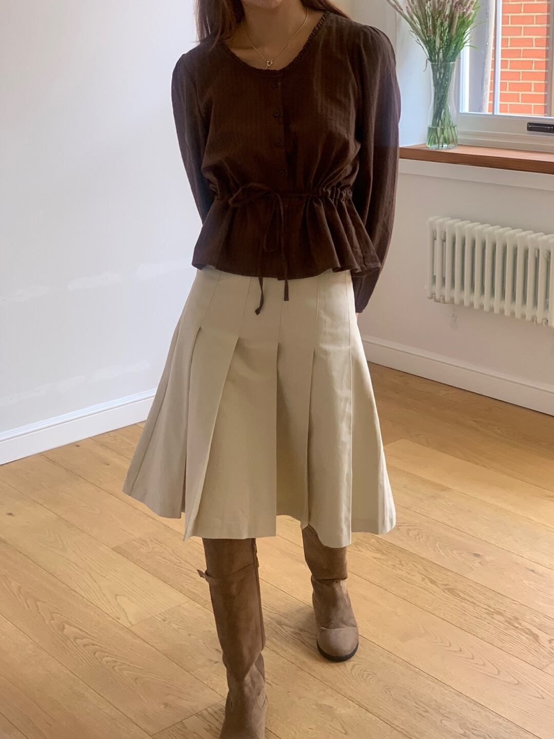 midi pleats trench SK(ivory)が新登場!このトレンチスカートは、秋冬のシーズンにぴったりなアイボリーカラーが特徴で、コーディネートに柔らかさをプラスします。しっかりしたトレンチのコットン生地を使用しており、着心地も良く、高級があります。デイリーからお出かけまで幅広いシーンで活躍するアイテムです。美しいミディ丈のプリーツが施されており、歩くたびに優雅に揺れるシルエットが魅力的です♡どんなトップスとも相性抜群で、あなたのスタイルをより引き立ててくれる一枚です。